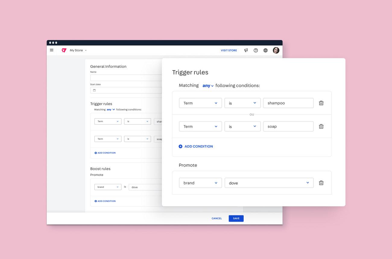 With our merchandising tools, you can define context-driven strategies to promote specific products, brands or categories. For example, you can define that if a customer searches for "shampoo" and/or "soap", the search engine will promote a specific "brand". Just like a promotion, you can set up a start and end date and run multiple strategies at the same time. That's a simple example, but you can sum up multiple contexts and customer behaviors to trigger the strategy.