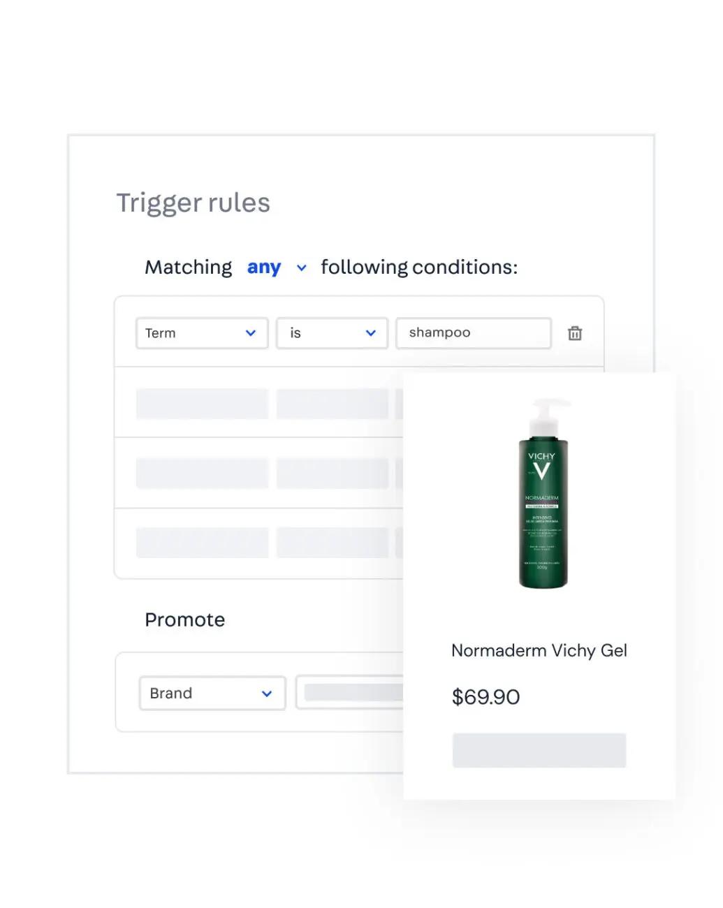 Promote specific products based on past and current user behavior by defining triggers – such as searched terms or applied filters – that will add, remove, or promote products, brands, or categories.